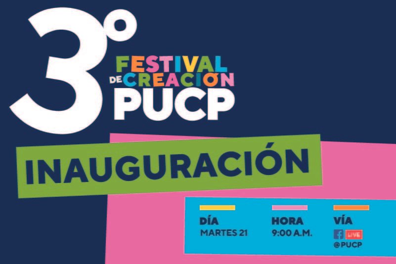 La Pontificia Universidad Católica del Perú presentará los días 21 y 22 de diciembre el 3º Festival de Creación, evento virtual gratuito dirigido a estudiantes universitarios, postulantes, artistas, arquitectos, diseñadores, gestores, cultores, antropólogos y comunicadores que anhelan compartir emociones y experiencias a partir de las creaciones fomentadas por la PUCP desde las disciplinas de artes escénicas, artes plásticas, diseño, comunicación audiovisual, escritura creativa, arquitectura y antropología visual.