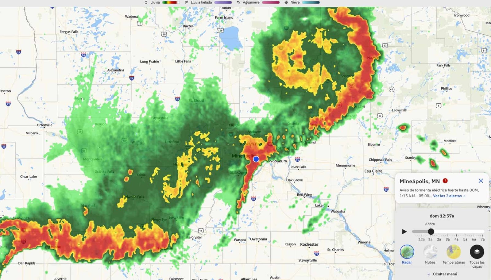 🌧 Tornado tracker y radar muestran núcleo de tormenta sobre Minneapolis