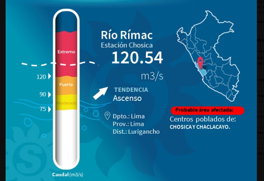 El Servicio Nacional de Meteorología e Hidrología del Perú (SENAMHI) ha reportado un incremento alarmante en el caudal del río Rímac, alcanzando 120.54 m³/s en la estación hidrológica Chosica. Este valor ha superado el umbral rojo, lo que indica alto riesgo de desborde e inundaciones en Chosica y Chaclacayo.