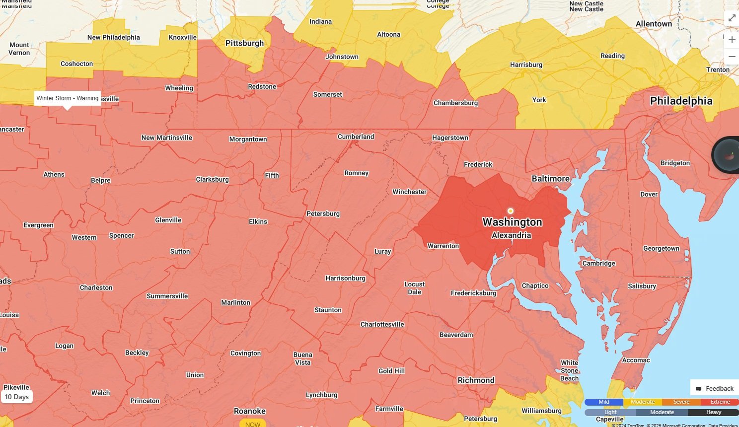 - Impacto: Los desplazamientos en el DMV serán peligrosos, afectando tanto el tráfico matutino como vespertino. Una segunda ronda de fuertes nevadas podría ocurrir el lunes por la noche antes de que la tormenta finalice.