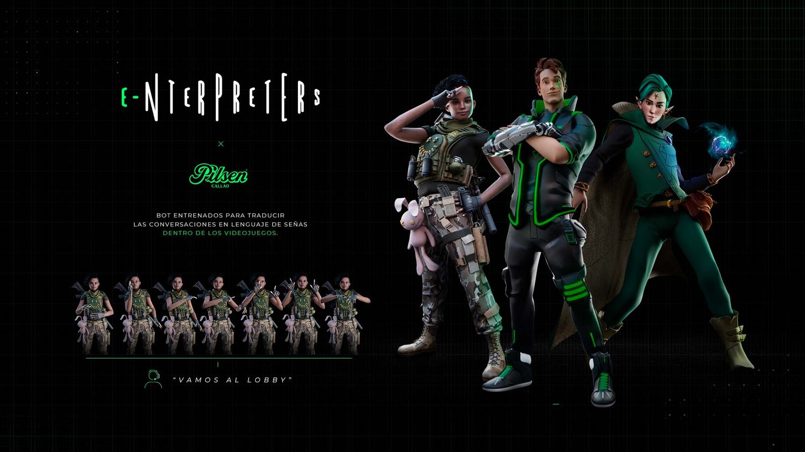 E-nterpreters contará con tres avatares que han sido diseñados de acuerdo a los tipos de videojuegos más populares actualmente, teniendo como referencias a Call of Duty, Fortnite y Arcane de Leage of Legends.