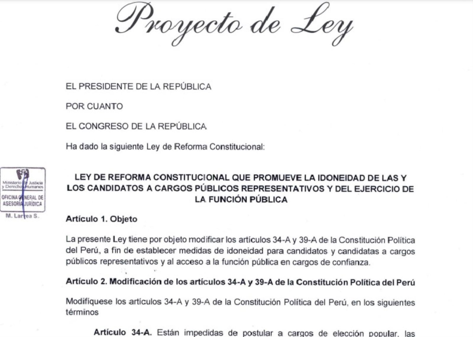 1. Proyecto de reforma constitucional 00682/2021-PE que promueve la idoneidad de las y los candidatos a cargos públicos representativos y del ejercicio de la función pública.