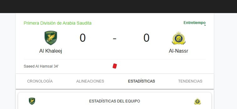 El segundo tiempo promete grandes emociones, con el Al-Nassr obligado a mejorar su efectividad en ataque para capitalizar la ventaja numérica, mientras que el Al Khaleej intentará resistir y llevarse un punto clave frente a uno de los favoritos al título.