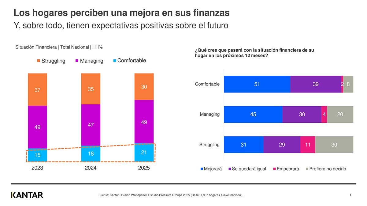 Entre 2024 y 2025, los hogares “Comfortable” aumentaron 3 puntos porcentuales, y los “Managing” crecieron en 2 p.p., indicando una leve mejora económica.