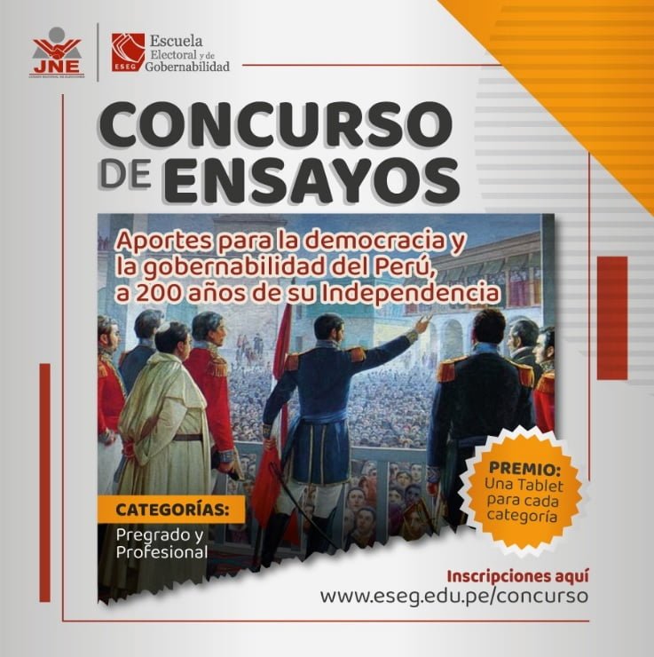 El Jurado Nacional de Elecciones (JNE), a través de la Escuela Electoral y de Gobernabilidad (ESEG), está convocando a estudiantes de pregrado y a profesionales a fin de que participen en el concurso de ensayos “Aportes para la democracia y la gobernabilidad del Perú a 200 años de su independencia”.