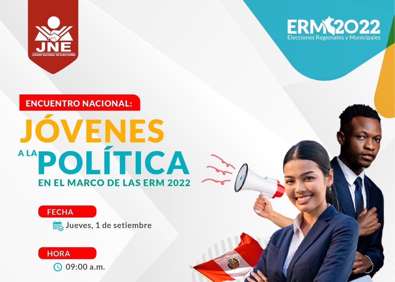 El Jurado Nacional de Elecciones (JNE) organiza el “Encuentro nacional: Jóvenes a la política, en el marco de las Elecciones Regionales y Municipales (ERM) 2022”, un espacio de intercambio entre candidatos y candidatas jóvenes, quienes tendrán la oportunidad de capacitarse y trabajar en la conformación de una red multipartidaria en favor de la agenda de las juventudes.