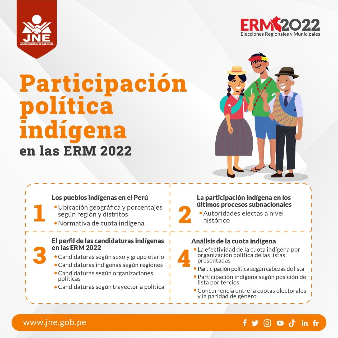 El reporte, denominado “Participación política indígena en las ERM 2022”, indica que dichos datos evidencian la aplicación de la concurrencia de cuotas por parte de las organizaciones políticas a este tipo de candidaturas.