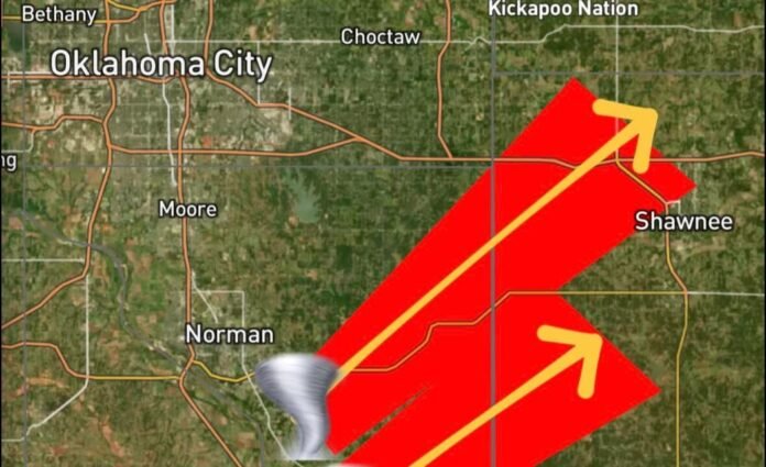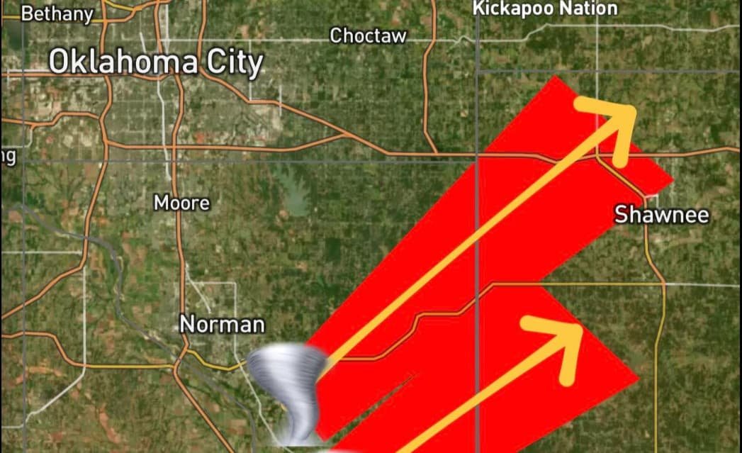 Minutos después, a las 7:45 a. m., las autoridades confirmaron un tornado activo cerca de la localidad de Pink, avanzando hacia el noreste a una velocidad aproximada de 80 km/h (50 mph). Esta segunda alerta incluyó áreas del noreste del condado de Cleveland y el noroeste de Pottawatomie, elevando el nivel de riesgo para las comunidades cercanas.