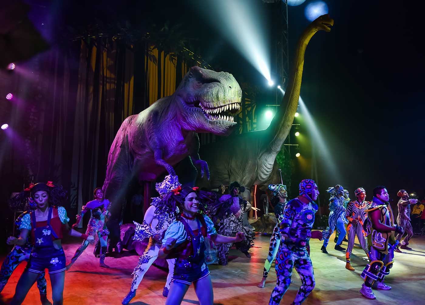 Durante su periplo afrontan emocionantes episodios con Triceratops, Tyrannosaurus, Braquiosaurios y otras criaturas insólitas. Pero al culminar la expedición, un detalle inesperado trae a nuestro tiempo a los enormes dinosaurios. En ese trance, el público disfrutará de hermosas coreografías, música exclusiva del compositor francés Pierre Pichaud y atractivos números de circo — como la báscula coreana, el mástil aéreo, el pole chino, la rueda Cyr, escenas de equilibrio, acrobacia y malabarismo – ejecutados por un elenco de 25 profesionales dirigidos artísticamente por Alexander Grimaylo.