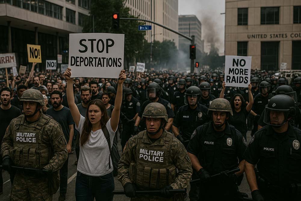 DSN Noticias – Los Ángeles, EE. UU. Cientos de manifestantes salieron a las calles en rechazo a una serie de redadas migratorias impulsadas por la administración Trump. La situación se tornó violenta tras la llegada de la Guardia Nacional y el uso de gases lacrimógenos por parte del LAPD. La comunidad latina, organizaciones proinmigrantes y líderes estatales denunciaron lo ocurrido como una escalada autoritaria que pone en riesgo los derechos civiles.