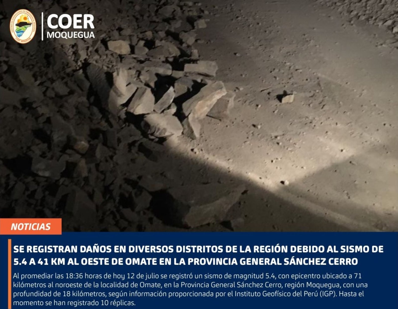 Dos heridos leves, daños materiales en viviendas de adobe y en la oficina de la municipalidad distrital, y en las redes de agua potable y desagüe; así como deslizamientos en diversas vías comunales es el saldo del fuerte sismo de magnitud 5.4 reportado ayer en Moquegua y las posteriores réplicas registradas anoche y en la madrugada de hoy.