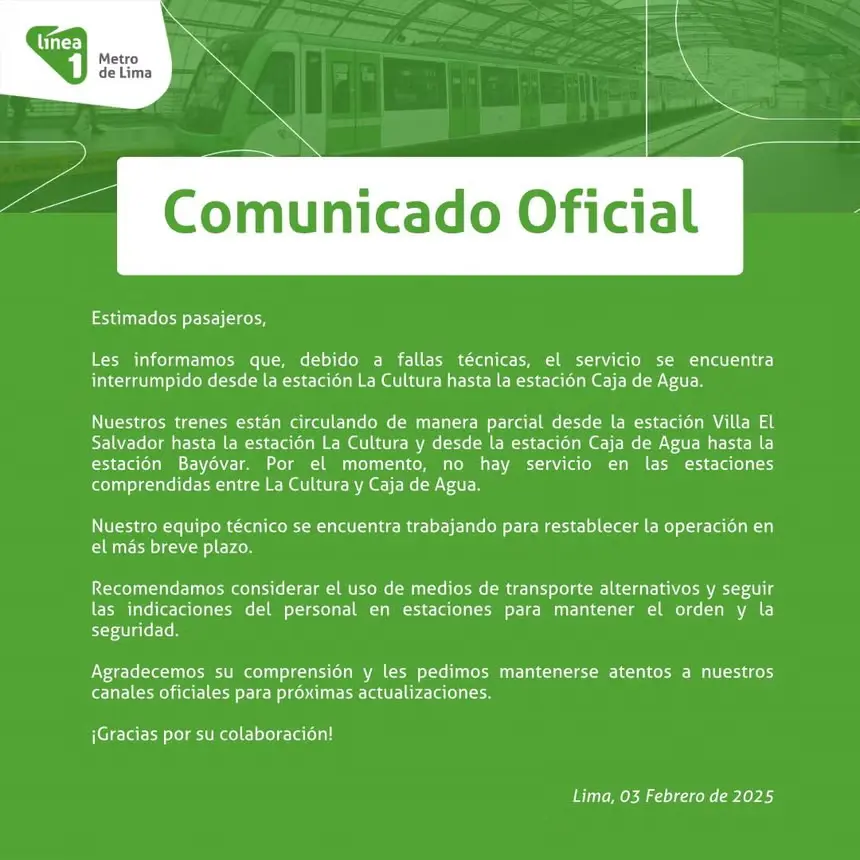 COMUNICADO OFICIAL DE LA LINEA 1 DEL METRO DE LIMA
