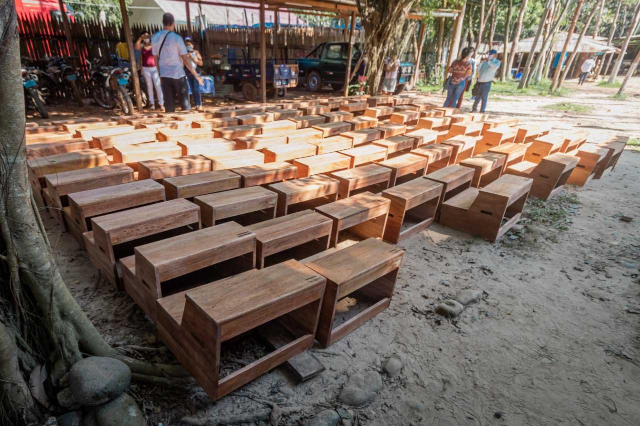 La fabricación de los escalones se hizo posible tras la donación de 1 200 pies tablares de madera incautada por la Gerencia Regional Forestal y de Fauna Silvestre del Gobierno Regional de Ucayali.