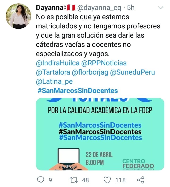Los alumnos de la Facultad de Derecho y Ciencia Política de la Universidad Nacional Mayor de San Marcos (UNMSM), realizaron un “tuitazo”, como protesta ante su futura situación académica, puesto que vienen reclamando que los profesores nombrados impuestos no son especialistas en sus respectivas cátedras asignadas.